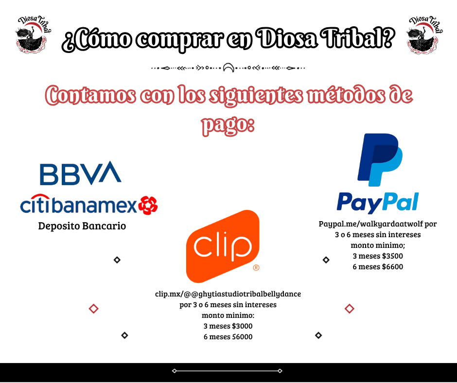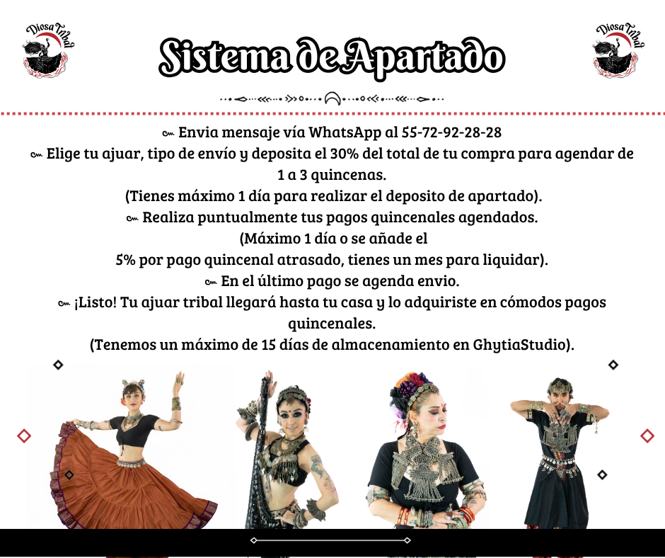 Tribal bellydancer, a continuación enumeramos las diversas formas que tienes en Diosa Tribal para adquirir tu elegante ajuar, en una sola exhibición, sistema de apartado y mas.