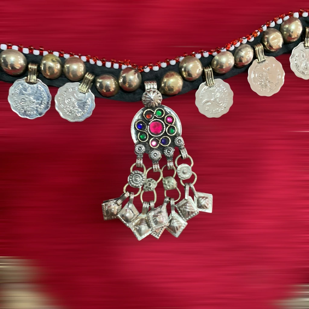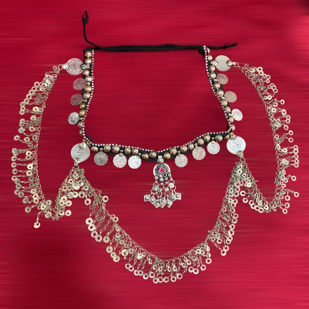 ๛Cinto metalicos Kuchi con diseño de triple cadenas, acompañadas con monedas y botones kuchi con una pieza central con cristales naturales multicolor.