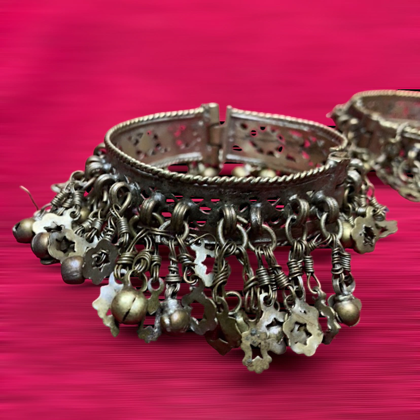 ๛Par de brazaletes con entramado, cadenas, sonajas y especias.